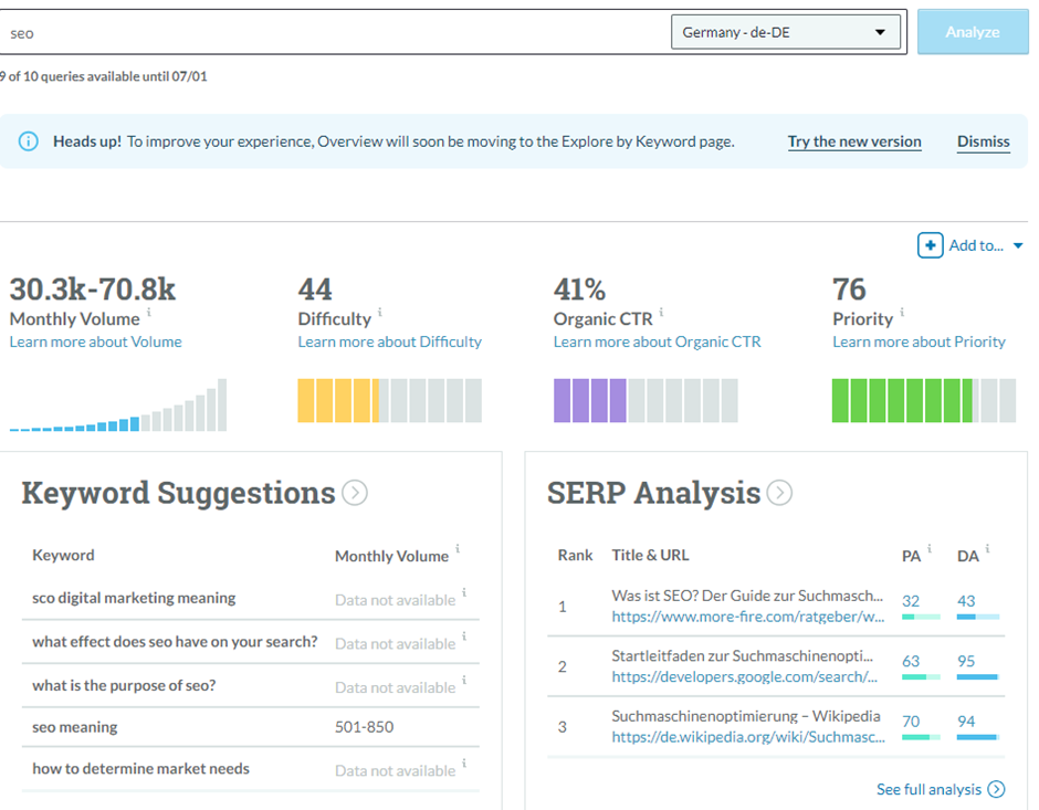 Moz Keyword Explorer ist ein leistungsstarkes SEO-Tool, das speziell für die Keyword-Recherche und -Analyse entwickelt wurde. Es bietet umfassende Einblicke in verschiedene Aspekte von Keywords, was es besonders nützlich für die Entwicklung effektiver SEO-Strategien macht. Mit Moz Keyword Explorer können Nutzer neue Keyword-Ideen generieren und deren Suchvolumina analysieren, um potenziell wertvolle Keywords zu identifizieren.