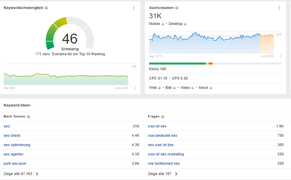 Darüber hinaus bietet das Tool eine Einschätzung der Keyword-Schwierigkeit, was hilft, die Wettbewerbsintensität für jedes Keyword zu bewerten. Eine weitere wertvolle Funktion ist die Anzeige der Click-Through-Rates (CTR) und der Suchabsichten, die Einblicke in das Nutzerverhalten und die Wahrscheinlichkeit geben, dass Suchende auf bestimmte Ergebnisse klicken. Schließlich ermöglicht Ahrefs Keywords Explorer die Untersuchung der Top-Rankings für bestimmte Keywords, was es einfacher macht, die Strategien der Konkurrenz zu verstehen und zu übertreffen.