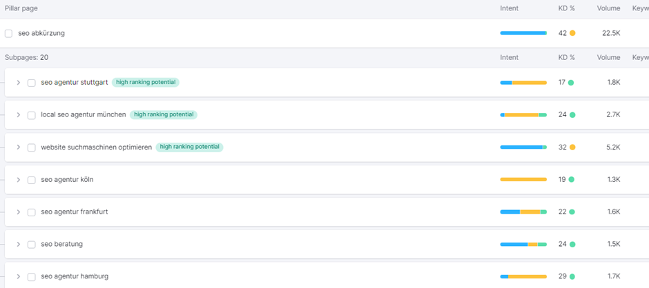 Der Keyword Strategy Builder ist ein Feature, das von SEMrush 2024 neu eingeführt wurde. Anhand eines vorgegebenen Themas können zugehörige Unterseiten mit den passenden Suchbegriffen hinterlegt werden. Neben empfohlenen Suchbegriffen können Insights wie Suchintentionen, Keyword Difficulty, Suchvolumen und Referenzseiten genauer analysiert werden.