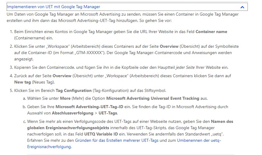 Damit auch Zielvorhaben in das System integriert werden, müssen die Tracking Codes auf die Seite integriert werden. Meine bevorzugte Methode ist der Einbau über den Google Tag Manager. Es gibt auf der Bing Plattform auch eine Anleitung, wie ihr das einbaut. Ist ein wenig gewöhnungsbedürftig für den Start. Aber wenn man einige Male über den Tag Manager die ganzen Sachen integriert hat, ist es reine Routine. Ideal wäre es, wenn die ganzen Conversions, die schon in Google Ads definiert 1:1 mit den ganzen Triggern übernommen werden. Nur die Drittanbieterplattform und die IDs sind ausgetauscht.